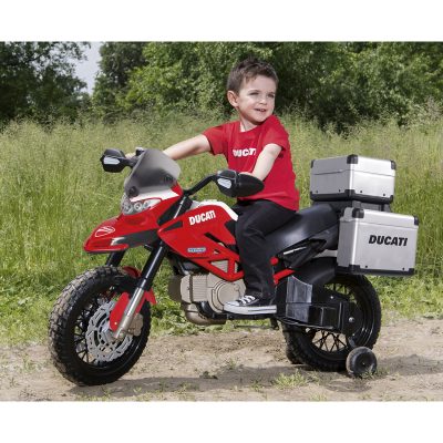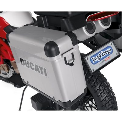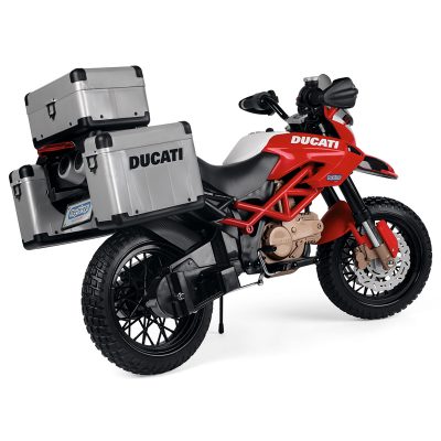 Die drei Koffer, von welchen zwei abgenommen und mitgenommen werden können, verleihen dem Motorrad einen Abenteuer-Look. Das garantiert den Spielspaß rund um das Fahren. Die Ducati Enduro wurde speziell konzipiert, so dass sie bequem von Kindern unterschiedlicher Größe gefahren werden kann: Beine, Arme und Oberkörper finden immer den richtigen Platz, egal wie kurz oder lang sie sind. Der breite anatomisch geformte Sitz hat ein Muster mit Gripp-Effekt. Das sichtbare Fahrgestell, die großen Auspuffrohre, der Motor und das effektvolle Dekor verleihen dem Spielzeug ein realistisches Aussehen. Dazu gehört ein Spielzeug-Zündschlüssel.