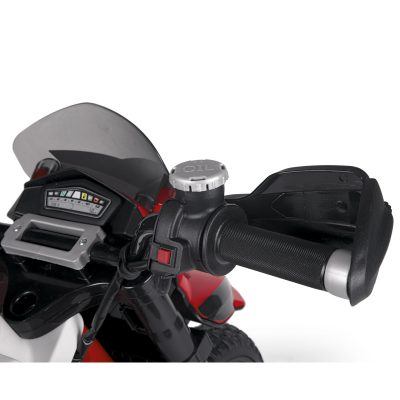 Das detailgetreu nachgebaute Elektromotorrad von Peg Perego lässt die Herzen der Nachwuchsfahrer höher schlagen. Die Abenteuervariante des bekannten italienischen Herstellers besitzt natürlich einen Handgashebel und eine Pedalbremse, genau wie die große Ducati auch. Viele Details wie die Hupe, der Scheinwerfer, der wie eingeschaltet aussieht, sowie die breite und getönte Windschutzscheibe geben dem Motorrad ein einmaliges Aussehen.