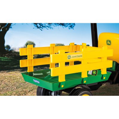 An die Traktoren von John Deere angehängt, bietet der zweirädrige John Deere Stake Side Trailer viel Ladefläche für ausgiebige Abenteuer. Der Stake Side Trailer in der unverwechselbaren John Deere-Farbe ist der ideale Kamerad für Spiele im Freien und für den Transport vieler Materialien auf der Ladefläche, die an drei Seiten mit Plastiklatten in Holzoptik umrandet ist. Der Boden der Ladefläche ist mit einem rutschfesten Muster dekoriert und verfügt über eine Tragkraft von bis zu 10 kg. Die offene Seite ermöglicht das einfache Be- und Entladen.